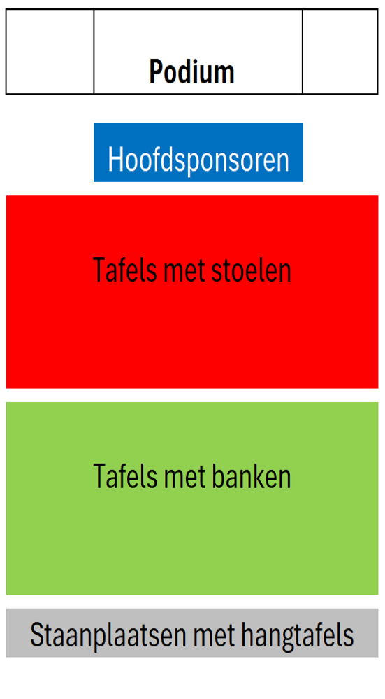 Alleen de plaatsen met stoelen zijn te reserveren. Plaatsindeling wordt door de organisatie vastgesteld op volgorde van aanmeldingen en een automatische indeling op basis van grootte en staat niet ter discussie. Dit gaat plaatsvinden in mei 2024. De plaatsen met banken en staanplaatsen zijn niet te reserveren. Hier geldt de volgorde van binnenkomst.